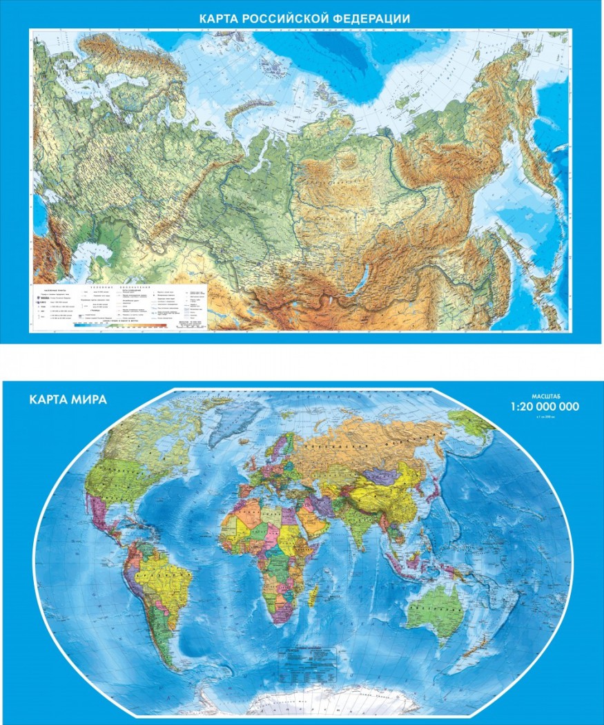Комплект состоящий из двух ярких и красочных карт: мира и РФ. Они идеально впишутся в интерьер любого класса. Просты и лаконичны. На картах четко прорисованы все мелкие детали, подписаны все материки, страны, моря, океаны и проливы, а также прописаны все условные обозначения, каждый город, все реки и озёра и многое другое. Они яркие, это означает, что даже на последних партах ученики смогут их разглядеть. Но главное их преимущество заключается в том, что они качественные. Эти карты изготовлены из ПВХ-пластика, пленки с фотопечатью и ламинирующей пленки, а это значит, что они прослужат долгие годы, сохраняя первоначальный вид. Краска не поблекнет и не выцветет.