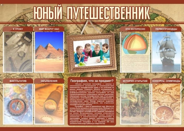 Удобный и красивый стенд "южный путешественник" станет изюминкой класса. На нем расположены восемь красочных фотографий, которые заинтересуют учеников, а в центре стенда красуется определение географии. Но помимо его красоты, этот стенд еще и функционален: на нем присутствуют восемь кармашков с подписями: к уроку, мир вокруг нас, факультатив, объявления, это интересно, первопроходцы, история открытий, конкурсы, олимпиады. Благодаря таким табличкам ученики быстро найдут нужную информацию на стенде. Качество стенда на высоком уровне, это означает, что такой стенд прослужит долгие годы.