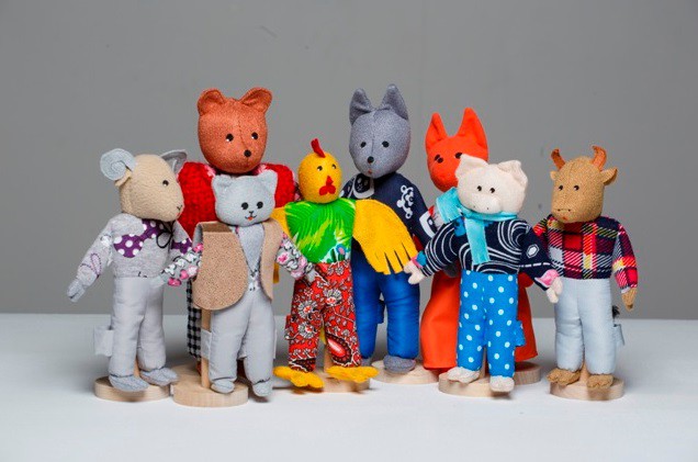 Перед вами – шагающий театр «Зимовье», в который входят следующие персонажи: баран, медведь, кот, петух, волк, лиса, поросенок, бык.