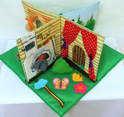 Разделена на 4 зоны: кухня с печкой, комната с окошком и полатями, садик перед домом с лужайкой и забором, лес с деревьями. Все это дополнено навесными элементами (тучка, птичка, бабочка, куст, цветочек) для более интересной игры.