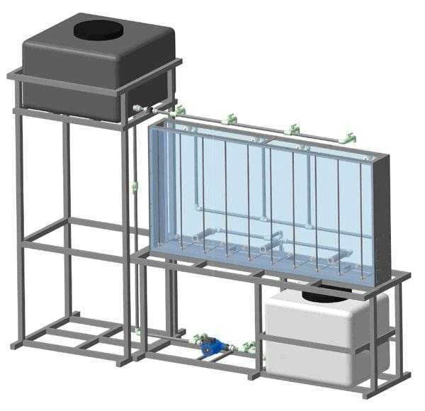 Лоток выполнен из нержавеющей стали и имеет размер 2000х250х1000 мм. Для визуализации гидравлических процессов передняя стенка лотка выполнена из прозрачного материала (стенка имеет координатную ось). На лицевой части лотка установлены 10 пьезометров расположенные на равном расстоянии друг от друга, позволяющие наблюдать за уровнем воды в лотке. На дне лотка установлены три дренажные трубки (обернутые дренажным полотном) отводящие воду в сливную трубу.
