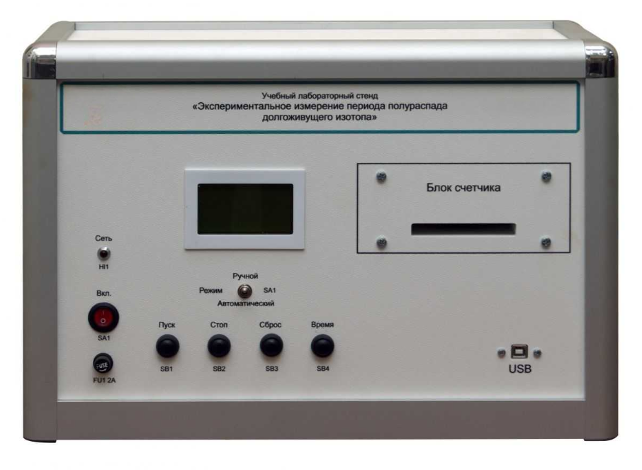 Экспериментальная установка является прототипом (учебной моделью) установки для исследования радиоактивного распада. Учебный лабораторный комплекс представляет собой действующую модель, функционально не отличающуюся от своего базового научного прототипа для исследования характеристик радиоактивного распада. Прибор позволяет воспроизвести серии измерений интенсивности излучения от радиоактивного источника 40К в соли KCl (количество актов радиоактивного распада), определить активность изотопа и вычислить период полураспада. В приборе отсутствует реальный радиоактивный источник излучения (используется его модель), а все результаты эксперимента содержатся в базе данных микропроцессора.
