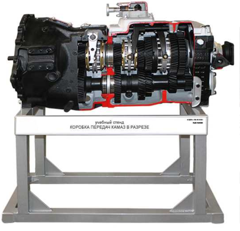 Учебное оборудование представляет собой коробку передач автомобиля КамАЗ в разрезе закрепленную на жесткой металлической подставке (раме).