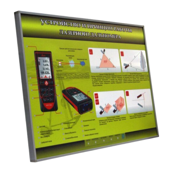 Электрифицированный стенд представляет собой информационную панель с раздельной световой индикацией. На стенде представлена информация об устройстве и принципе работы лазерного дальномера, а также о его основных конструктивных элементах. В конструкцию учебного оборудования интегрированы магниточувствительные сенсоры для управления стендом при помощи интерактивного воздействия приемо-передающих устройств. Предусмотрено два режима работы со стендом: "Обучение" и "Контроль".