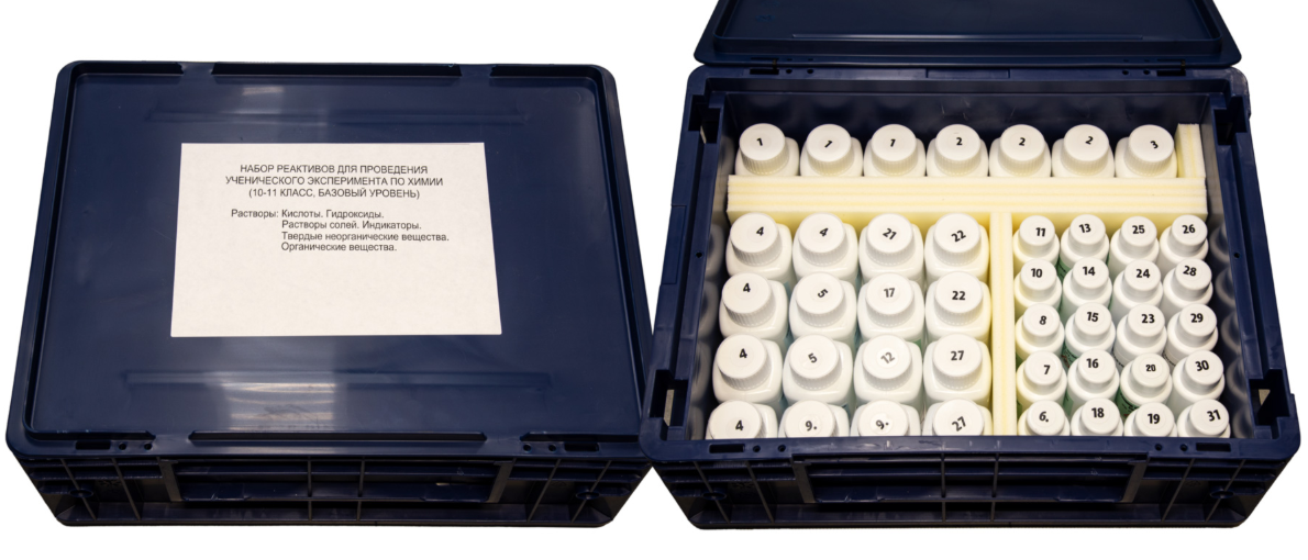 Включает 31 готовых к использованию реактивов, в т.ч. (3 кислоты, 2 гидроксида, 11 солей, 2 индикатора, раствор аммиака) , а так же органические и неорганические вещества, которые используются в лабораторной практикуме по химии на базовом уровне в 10-11 классах.