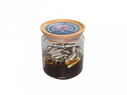 Модель представляет собой стеклянную банку с сигаретными окурками, залитой липким и вязким составом. Состав имитирует смолу, которая выделяется при выкуривании сигареты.