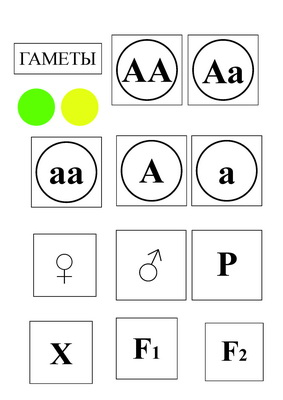 Пособие представляет собой комплект карточек прямоугольной, квадратной формы. К ним прилагается набор магнитов, с помощью которых карточки крепятся к доске. В пособии приведены схемы опытов Менделя, которые преподаватель может смоделировать на экране и таким образом доказать законы Менделя - единообразие первого поколения и законы расщепления во втором поколении.