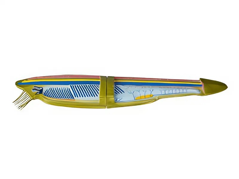 Модель демонстрирует внешнее и внутреннее строение ланцетника. Модель раскрашена в естественные цвета.