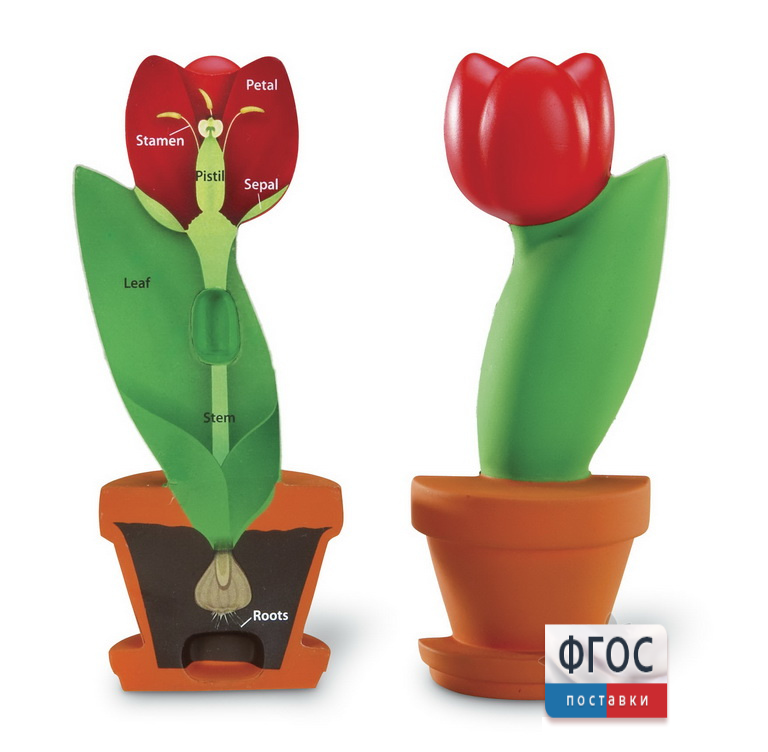Реалистично подробная пластиковая модель цветка разделяется на половинки и на одной половинке имеет названия частей цветка (на английском языке), на другой половинке - только буквенное обозначение, для самостоятельной проверки.